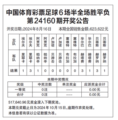 中国体育彩票足球6场半全场胜平负 第24160期开奖公告