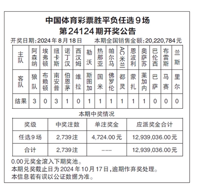 中国体育彩票胜平负任选9场 第24124期开奖公告