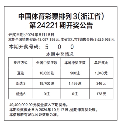 中国体育彩票排列3(浙江省) 第24221期开奖公告