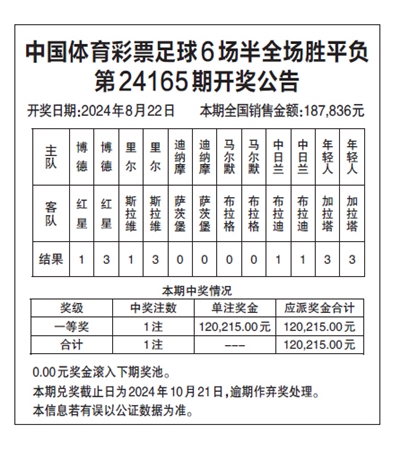 中国体育彩票足球6场半全场胜平负 第24165期开奖公告
