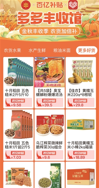 此外,丰收节期间,拼多多将投入10亿元补贴资金、20亿流量资源包扶持新质农货商家,进一步提升农产品上行的质量和效率,推动农产区直连全国消费者餐桌,持续丰富广大消费者的“米袋子”“菜篮子”和“果盘子”。
