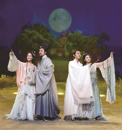 剧中苏东坡、西子、王朝云等角色吟唱的歌词,都源于苏东坡经典诗词。比如西子出场时演唱的“凤凰山下雨初晴,水风清,晚霞明”,让观众脑海浮现晚霞返照、凤凰山与西湖水交相辉映的美景。这首歌的歌词,就源自苏轼第一次在杭州任通判时创作的《江城子·江景》。第二幕中,由青年苏东坡、船家、富家小公子等吟唱的歌曲,融入了《饮湖上初晴后雨》《六月二十七日望湖楼醉书》等八首赞美西湖的东坡诗词,将苏东坡对西湖的眷恋娓娓道来。