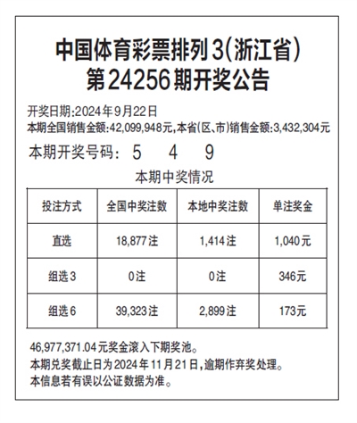 中国体育彩票排列3(浙江省) 第24256期开奖公告