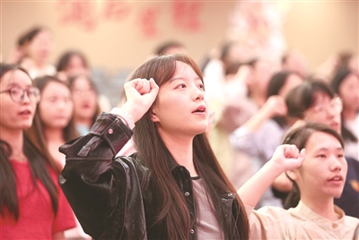 结业典礼上,蔡老师举起右拳,和今年入职的新教师们一起再次庄严宣誓。“回想一年前的初次宣誓,我心中依旧热浪翻滚,汹涌澎湃。”