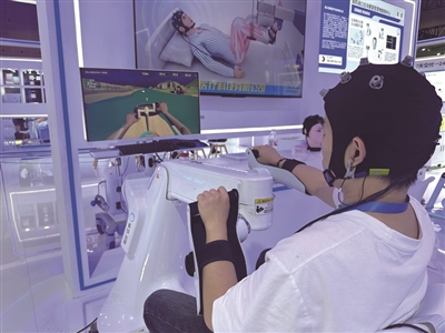 戴上特制的脑电帽,让电机与脑袋紧密贴合,看着屏幕上的捕鱼游戏,想象和思考划船动作,通过信号采集、传输,设备就自动运转了起来,带动上肢做出相应动作。浙江迈联科技工作人员的演示,让观众赞叹不已。