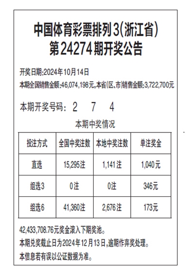 中国体育彩票排列3(浙江省) 第24274期开奖公告