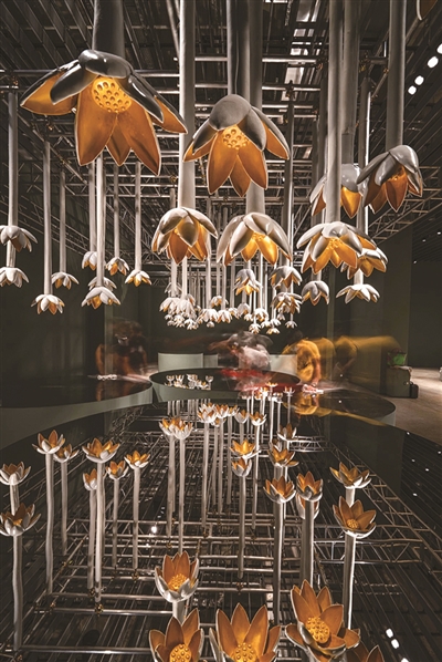 艺术家朱乐耕的作品《莲之镜像》极具创新性,开创了当代陶艺的新纪元,是一个可进入、可同框的空间环境,因此可命名为空间装置陶艺。几十枝莲花从空中垂挂而下,就像是莲从天上来。莲花的下方置放的一面面镜子,让金色的莲瓣倒映在镜中,与观众同框同在,相互交映。