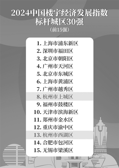 近日,在中国国际服务贸易交易会·2024(第四届)中国楼宇经济北京论坛上,“2024中国楼宇经济发展指数标杆城区30强”发布,勾勒出了全国楼宇经济发展的新格局。其中,杭州两个城区上榜,上城区排第8位,西湖区居第13位。