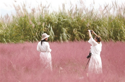 花海中,抱着孩子的夫妻,背着单反的老人,拗造型的丝巾阿姨,还有遛狗的人络绎不绝。“每天,市民游客、婚纱摄影和网红直播接踵而至,纷纷打卡这片梦幻粉。特别是萧山的婚纱影楼,带着新人天天往这个草丛里钻。”义桥镇相关工作人员说。