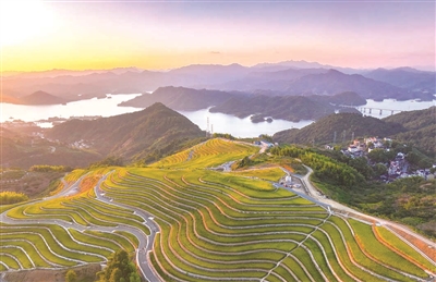 这段时间,黄澄澄的稻田仿佛给山顶披上了“黄金衣”,层层叠叠宛如大地的指纹错落有致地铺展在千岛湖青山绿水间。