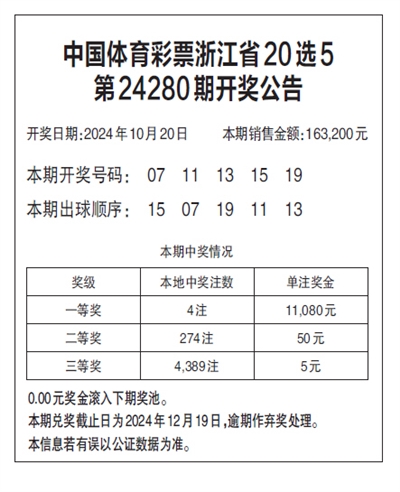 中国体育彩票浙江省20选5 第24280期开奖公告