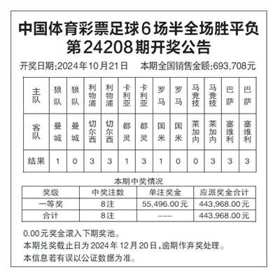 中国体育彩票足球6场半全场胜平负 第24208期开奖公告