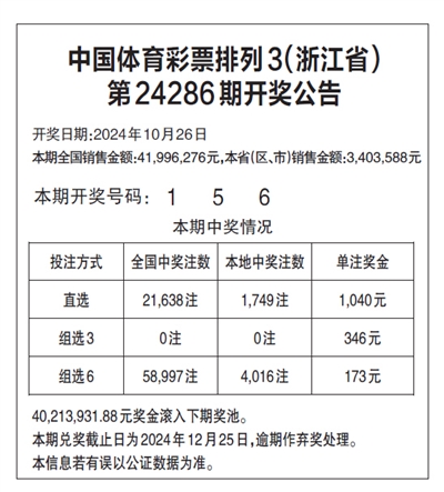 中国体育彩票排列3(浙江省) 第24286期开奖公告