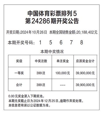 中国体育彩票排列5 第24286期开奖公告