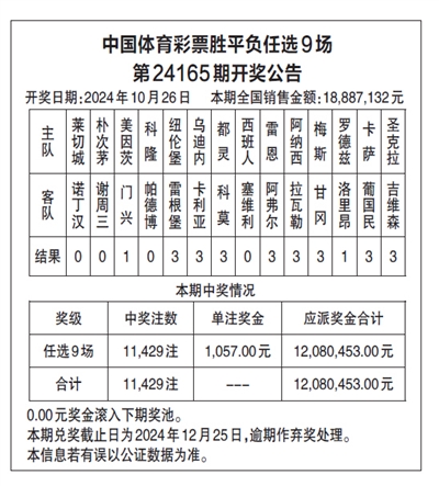 中国体育彩票胜平负任选9场 第24165期开奖公告