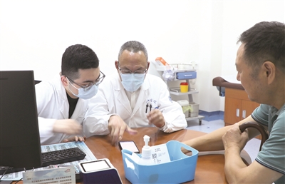 陈军书记(左二)在门诊中为患者解读检查报告 医院供图