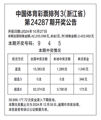 中国体育彩票排列3(浙江省) 第24287期开奖公告