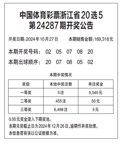 中国体育彩票浙江省20选5 第24287期开奖公告