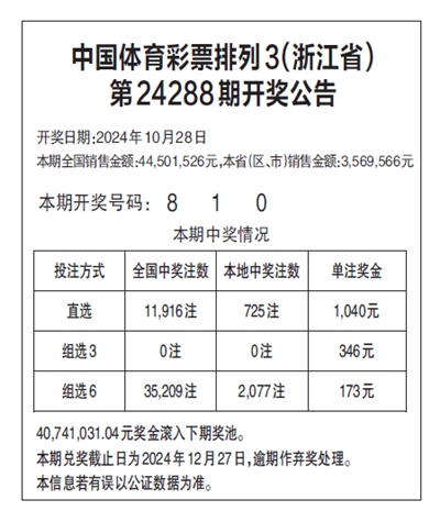 中国体育彩票排列3(浙江省) 第24288期开奖公告