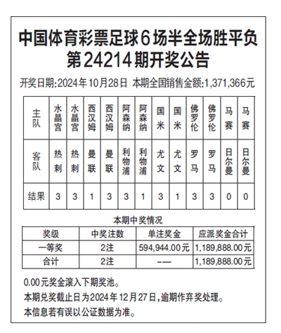 中国体育彩票足球6场半全场胜平负 第24214期开奖公告