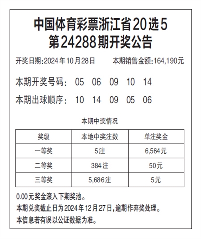 中国体育彩票浙江省20选5 第24288期开奖公告