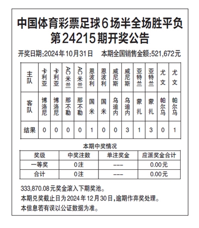 中国体育彩票足球6场半全场胜平负 第24215期开奖公告
