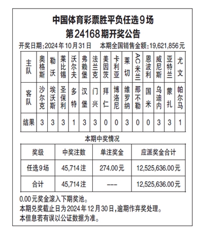 中国体育彩票胜平负任选9场 第24168期开奖公告
