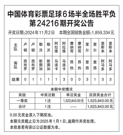 中国体育彩票足球6场半全场胜平负 第24216期开奖公告