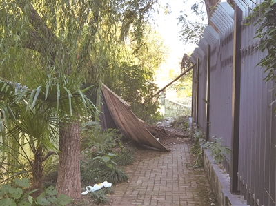 长德公寓小区后面的河边,木板和树枝挡住了步行道。 记者 汤晨琛 摄