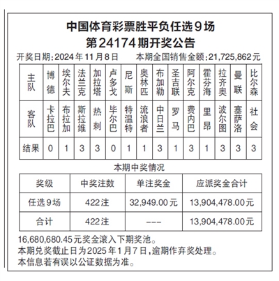 中国体育彩票胜平负任选9场 第24174期开奖公告
