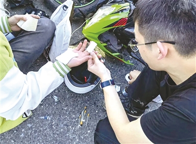 俞嘉辉立刻取出车上放着的急救包,为两位伤者清创止血,进行了简单的包扎,并告知之后有任何不适,还是要尽快就医。两位年轻人连声感谢俞嘉辉,等待拖车上来把他们的车拖走。