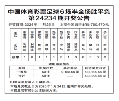 中国体育彩票足球6场半全场胜平负 第24234期开奖公告