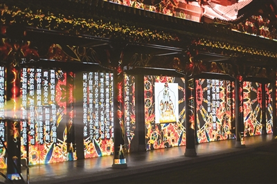 延续去年数字化光影展示形式,本次展览继续以光影灯光秀的数字展陈语言创新讲述文物故事。巧妙的是展览空间由临街德寿红墙转移至慈福宫广场,将仿宋建筑庭院及红墙形成围合式美学场景,突破传统展览空间限制,增强了观众的沉浸感与参与感。
