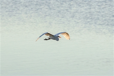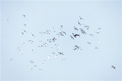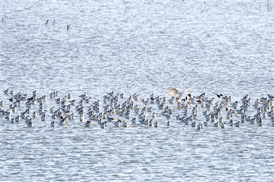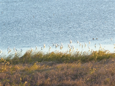 在和吴晓丽聊天时,湖面上的鸟群飞了起来。有反嘴鹬、白琵鹭、野鸭、白鹭等。有人举着望远镜问:“是不是还有一只猛禽?”