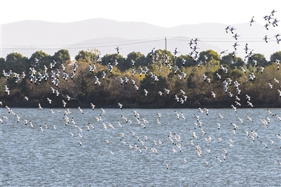 11月29日清晨,我们来到钱塘大湾区湿地公园,看到反嘴鹬时而在水面上梳理羽毛,时而成群起飞。数百只鸟儿在空中飞翔,不断变换造型,如同翻滚的波浪,十分壮观。