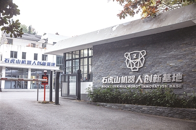 群山环抱,三幢半围合式拼接建筑掩映在葱郁林木间,白色外墙上留着一个虎头logo。旁边一条小道,直通山腹。三年前的11月10日,浙大控制科学与工程学院和灵隐街道联手,在这里成立石虎山机器人创新基地。
