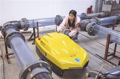 学生在智能检测机器人创新工坊调试环境监测无人船
