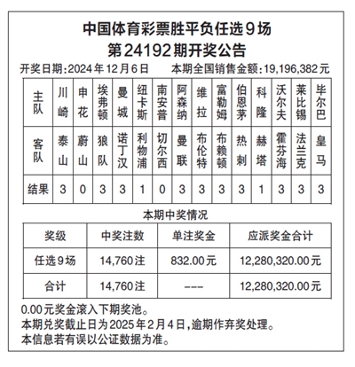 中国体育彩票胜平负任选9场 第24192期开奖公告
