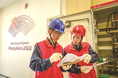 倪萍(右)在富阳水上运动中心与团队成员一起核对设备情况 黄辉 摄