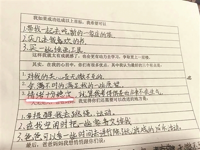 在“人无完人,孩子觉得爸爸妈妈还可以改进的地方”一栏,孩子提到,爸爸可以多一些时间去进行除了玩游戏的娱乐活动。橙友说,孩子的父亲周末为了释放工作压力,会选择玩电脑游戏,有时玩得很晚,她就有些怨言,结果孩子听到了,就提了这个建议。