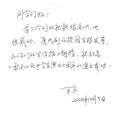 校园演出后,学校辗转联系上曹禺的女儿万方,这位70多岁的老人很开心,原本想亲自来杭州,后因身体原因未能成行,特地给同学们写来寄语:“看了你们的视频很高兴,也很感动。愿戏剧在校园生根发芽,为你们的生活插上翅膀。祝纪念《雷雨》在中学首演九十周年的演出成功。”