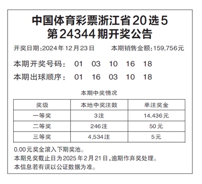 中国体育彩票浙江省20选5 第24344期开奖公告