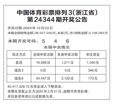 中国体育彩票排列3(浙江省) 第24344期开奖公告