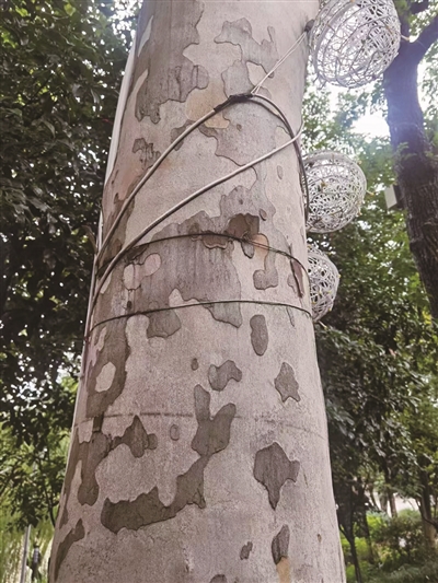 大兜路很多梧桐树绑了铁丝