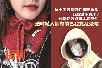 来橙友圈#时髦经#话题下发帖,分享你的冬季搭配单品,带上#搭配单品推荐#的标签。打卡5次以上(包括5次,可间断)的橙友,我们将会根据帖子质量、发帖数、点赞数等综合指标选出5位,每人送出巴拉克拉法帽一个(5个颜色,随机送出)。