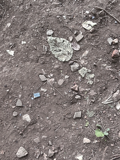 在一个有一定坡度的斜坡旁,看到一块带有蓝色螺旋花纹的碎片,长约两指,宽一指,厚度不到半厘米。小坡旁不远处有段黄白相间的警戒线。