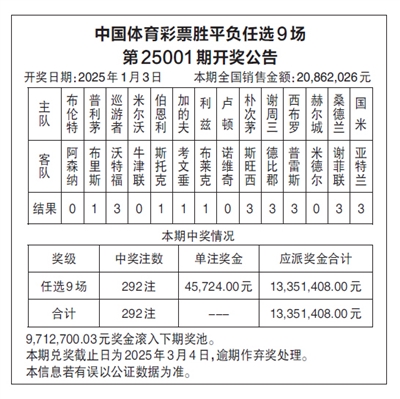 中国体育彩票胜平负任选9场 第25001期开奖公告