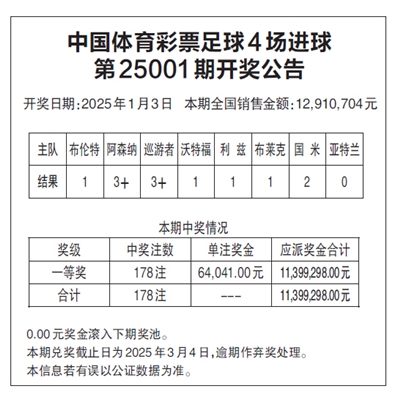 中国体育彩票足球4场进球 第25001期开奖公告