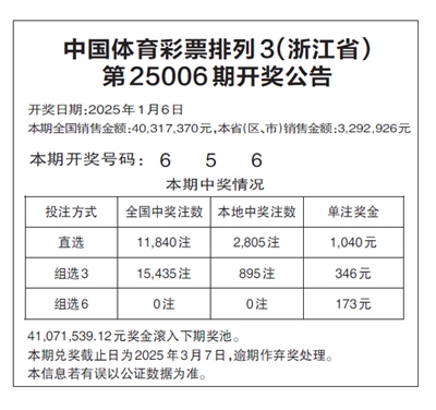 中国体育彩票排列3(浙江省) 第25006期开奖公告