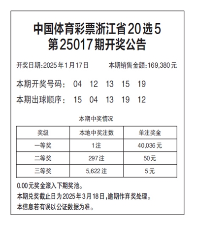中国体育彩票浙江省20选5 第25017期开奖公告